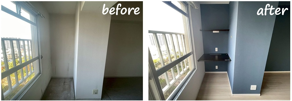 グレーのアクセントクロスと造作カウンターで、落ち着きのある集中空間に生まれ変わりました♪